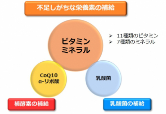 「ビタミン・ミネラル」「 補酵素 」「 乳酸菌 」を配合し 、"基礎の健康づくり“に複合的にアプローチ