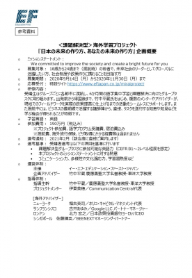 『日本の未来の作り方 あなたの未来の作り方』は、経済学者の竹中平蔵氏の協力のもと、世界4都市(ニューヨーク、サンフランシスコ、ロンドン、シンガポール)でビジネスの最前線で活躍するプロフェッショナルをアドバイザーとして特別招聘して行われる6か月間の海外学習プロジェクト。未来社会のリーダーとしてグローバルに活躍したい意欲溢れる18~24歳の若者約30名が参加する予定で、参加者はグループごとに、「SDGs」や「教育改革」、「ニューノーマル」といった世界共通課題に対し、海外で英語を学習しながら課題解決に向けたグループワークに取り組み、帰国後に課題解決に向けた政策提言を取りまとめる予定です。