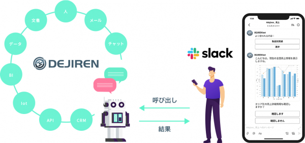 ・営業活動支援:契約情報や売上情報などをSlackアプリに入力するだけで、DEJIRENのBotを経由しSlackのチャット画面上で必要な情報を取得できるようになります。