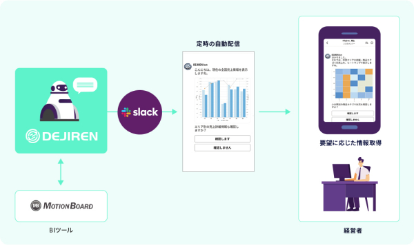 ・リアルタイムでの業績確認:BIツールの画面にアクセスすることなく、毎朝定時に役員に経営に関する情報をSlack上のチャンネル等へ、DEJIREN から定期配信。経営者が情報を知りたいときにもDEJIRENのBotを経由しSlackのチャット画面上で、リアルタイムの最新情報を呼び出すことができます。