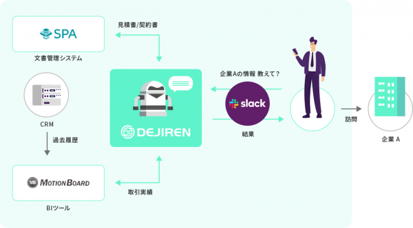 今回の連携により、DEJIREN経由で弊社サービスのBI製品「MotionBoard」やドキュメント管理ソリューション「SPA」に加え、「Box」、「Zoom」などの各種クラウドサービスやオンプレミス環境のシステムに直接アクセスせずとも、Slackのインターフェイスを介してインタラクティブかつ自由に情報を得られるようになります。