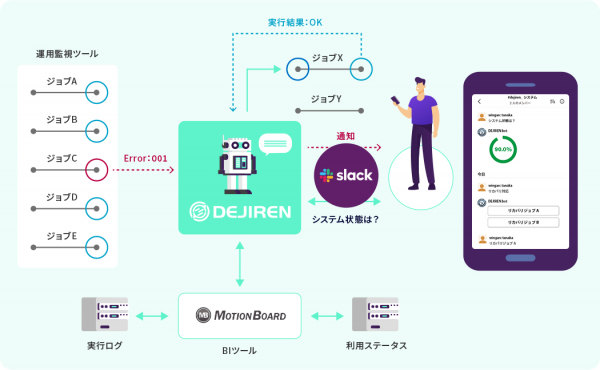 ・情報システム業務支援:他システムからのエラーや警告情報をプッシュ型でDEJIRENで受け取り、Slack上のDEJIREN Botが管理者に通知します。システム管理者は状況判断に必要な情報を確認の上、対応することができます。