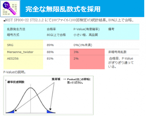 ・本ソフトが採用している乱数生成エンジンSRGはアメリカ政府が配布する検定ソフト「NIST-SP800-22」にて合格基準をクリアしてい ます。