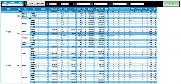<営業の予実管理表>見慣れた集計表形式で閲覧でき、画面上部で営業部や役割、支店名など、見たい軸で切り替えることができる(※本画面では、全てのデータ(営業部名、支店名、氏名、数値)にサンプルデータを使用しています)