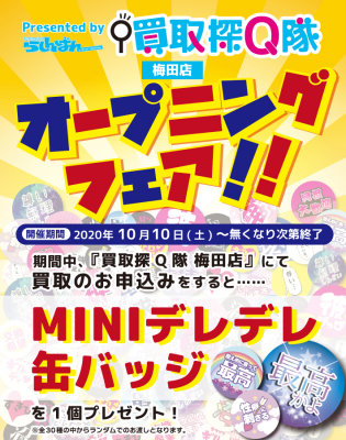 内容:期間中「買取探Q隊 梅田店」で買取をお申込みいただいた方にMINIデレデレ缶バッジ1点プレゼント