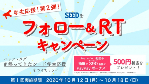 学生応援キャンペーンは、2020年6月に第1弾『学生応援!SEEDで大喜利~笑顔にピントを~キャンペーン』を実施し、学生の皆さまに大変ご好評いただきました。今回は、前回に引き続き学生を対象とし、株式会社シード広報担当(公式)Twitterアカウント「@SEED_koho」(以下、「本公式アカウント」)をフォロー、該当ツイートに指定のハッシュタグ「#帰ってきたシード学生応援」をつけて引用リツイートいただいた方の中から、厳正な抽選の上、PayPayボーナス500円相当をプレゼントいたします。