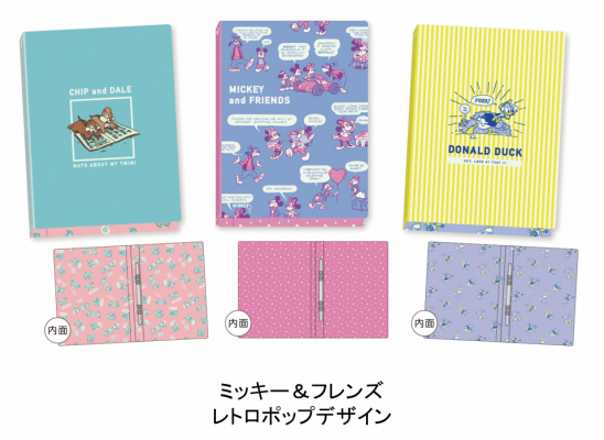 今回発売する第2弾は、ファイルの外面と内面の全面にカラー印刷を施し、思わず手に取りたくなるようなディズニーの世界観を表現したフラットファイルです。柄はディズニーの中でも大人気の「ラプンツェル」「ジャスミン」「アリエル」の≪ディズニープリンセスシリーズ≫と、お馴染みの人気者「チップ&デール」「ミッキー&フ レンズ」「ドナルド」をおしゃれに描いた≪レトロシリーズ≫の2種類です。デザインは、表紙・裏表紙・内表紙と別々の柄で、背表紙にもワンポイント入り。毎日の学習やファイリングを楽しく、おしゃれにサポートします。