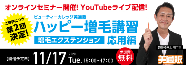 プロ向け美容材料の通信販売サイト「美通販」が、好評につき第2回目となる「ビューティーカレッジ美通販 増毛エクステンション 無料オンラインセミナー(応用編)」の開催を決定。人気の「ハッピー増毛」を使ったハッピー増毛講習をYouTubeにてライブ配信を行います。配信予定日時は、2020年11月17日(火)15:00~17:00。参加費は無料ですので、この機会にたくさんの方々にご参加いただきたい所存です。