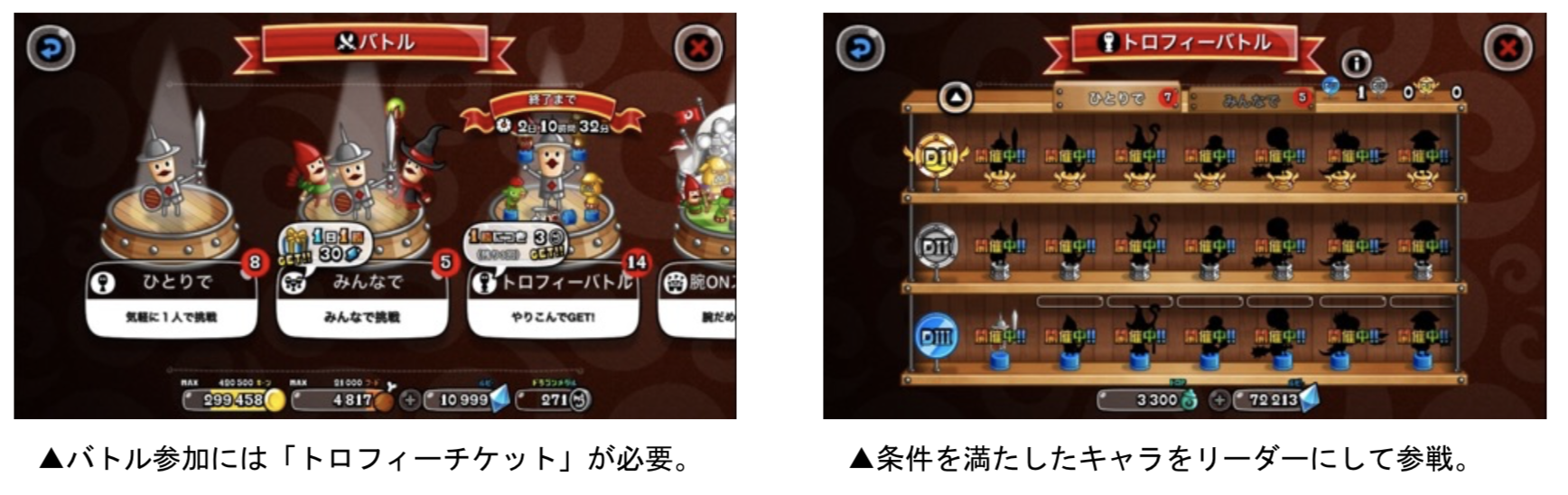 「トロフィーバトル」は、出場条件を満たしたキャラをリーダーにして戦い、“トロP”を獲得することが目的のバトルです。一定数のポイントがたまると、さまざまな報酬のほか、キャラの能力値が上昇する“D1武具”などが入手できます。