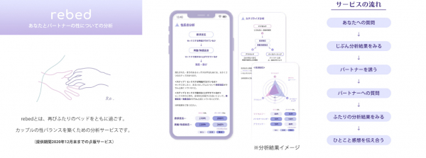 rebedでは性にまつわる3分程度の質問をもとに、満足のいくセックスを体験するための「準備ができているか」「喜びを感じられているか」を数値化・グラフ化してしめすとともに、分析結果を夫婦・カップル同士でシェアすることによって、セックスレスの予防・改善をサポートします。