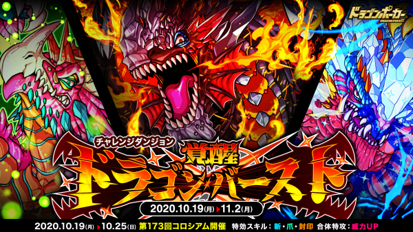 株式会社アソビズム(本社:東京都千代田区、代表取締役:大手智之)は、App Store・Google Playにて好評配信中のリアルタイム合体カードバトル『ドラゴンポーカー』で、2020年10月19日(月)より、復刻チャレンジダンジョン「覚醒ドラゴンバースト」を開催いたします。