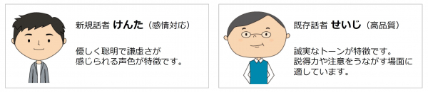 株式会社エーアイ(本社:東京都文京区、代表取締役社長:吉田大介、証券コード:4388、以下エーアイ)は、2020年10月20日(火)より、高品質音声合成エンジンAITalk(R)5のコーパスベース音声合成方式を活用し、喜び・怒り・悲しみの感情に対応した新規男性話者「けんた」を新規提供することをお知らせいたします。また、既存男性話者「せいじ」においても、DNN音声合成方式を活用した高品質音声版の提供を開始いたします。