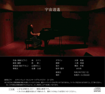 暗闇の中で60分間のピアノ即興演奏を収録。スタインウェイピアノを使って森ミドリが描く宇宙のサウンド。「宇宙逍遥」が完成。