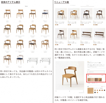 従来の商品紹介ページは材種違いの1品番ごとに1つのページが設けられていたため、検索結果には、ほぼ見た目が同じである材種違いのアイテムであっても別のサムネイル画像として表示されてしまい、初めて見るお客様には違いが分かりにくい上に検索結果が膨大に出力されていました。