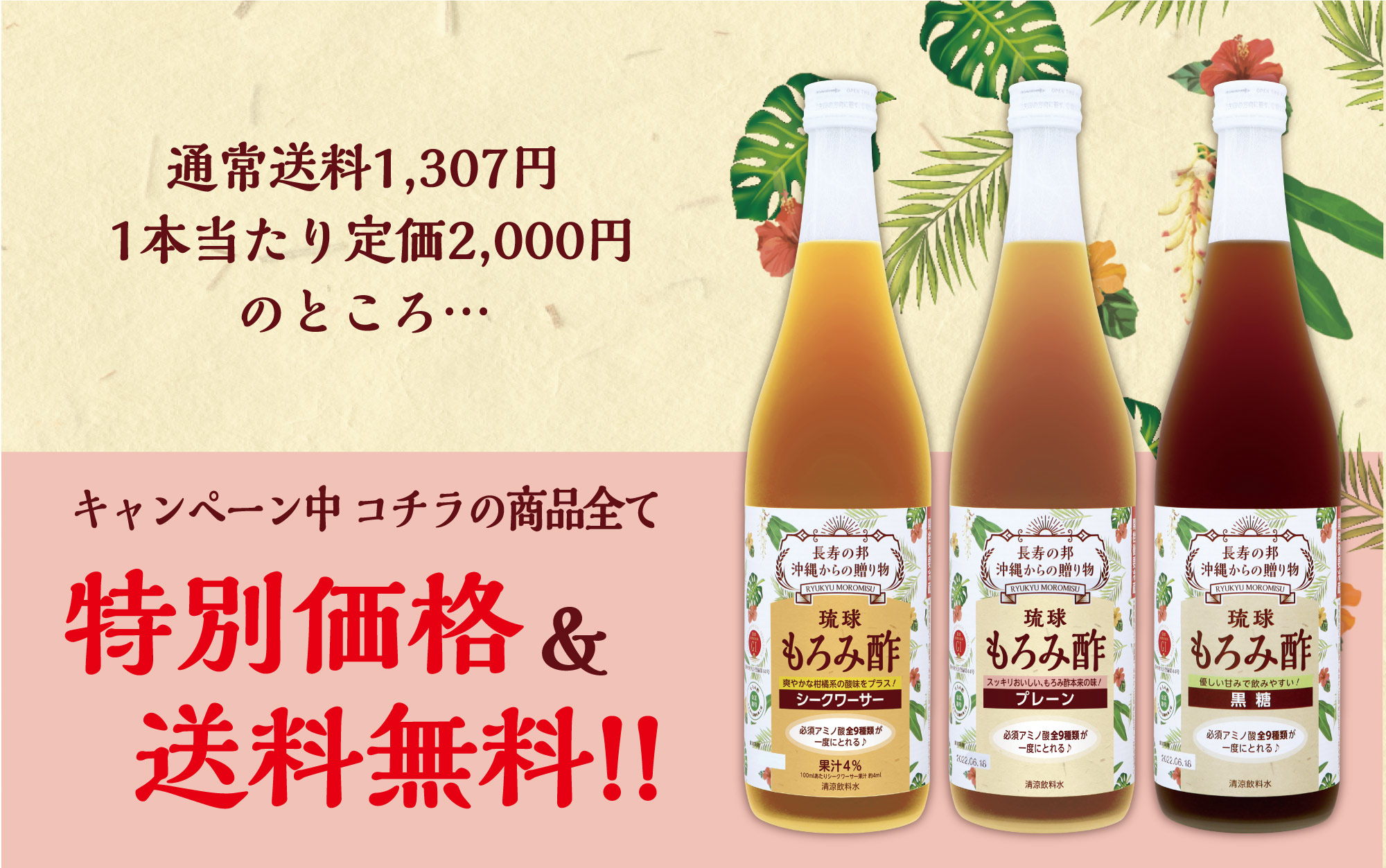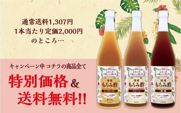 1本あたりの定価が2,000円のところ、1本あたり400円~750円引きの特別価格となっており、さらに沖縄からの送料1,307円についても無料。もろみ酢をお試しいただく最初のキッカケとして最高の機会になっております。ぜひこの機会に沖縄が誇る健康飲料、久米仙酒造の「もろみ酢」をお試しください。