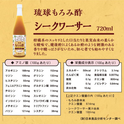もろみ酢とは、沖縄の伝統的なお酒「泡盛」を製造する過程で作られる醪(もろみ)を絞ることでできるクエン酸飲料のこと。もろみには、米麹(こめこうじ)が生み出したアミノ酸やクエン酸が豊富に含まれており、特に体内で合成されず必ず食べ物から摂取しなければいけない「必須アミノ酸」9種全てがバランスよく含まれているため、健康効果が見込まれています。