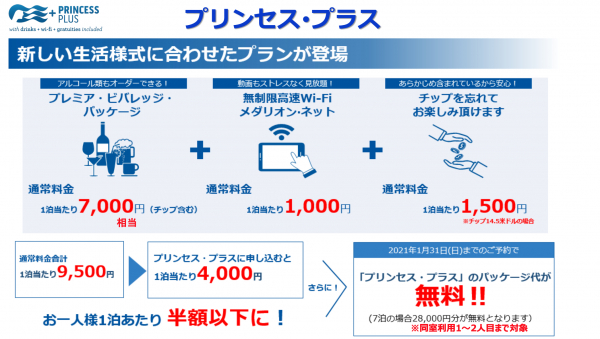 「プリンセス・プラス」とは、プレミアム・ビバレッジ・パッケージ(通常料金:1泊当たり7,000円相当(チップ含む))、無制限高速Wi-Fiメダリオン・ネット(通常料金:1泊当たり1,000円)、チップ(通常料金:1泊当たり1,500円)の3つをセット料金4,000円でご利用できるという新しくできたお得なパッケージプランです。2021年7月から同年10月出発のダイヤモンド・プリンセスをご予約の際に、オプションとして付けることができます。さらに、2021年1月31日までのご予約の方限定で、「プリンセス・プラス」が無料となります!7泊8日の場合だと、本来28,000円の追加料金が発生しますが、それが無料です(※同室利用1~2名様まで対象)。