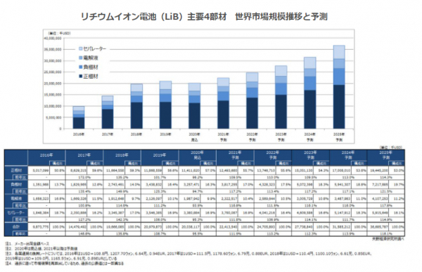 一方、民生小型セル向けのLiB主要4部材では、ノートPC向けやタブレット端末向けLiBがコロナ禍の影響による在宅勤務や教育機関での需要増で伸びを示している。上記を踏まえ、2021年以降は再び成長軌道に戻る見込みで、LiB主要4部材世界市場は引き続き車載用セル向け需要を主な牽引役として、市場拡大を続けると予測する。