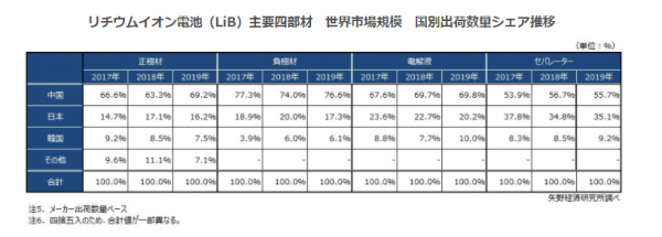 日本はセパレーターが30%台と比較的高い比率を維持しているが、2018年との比較では正極材、負極材、電解液において前年よりシェアを下げている状況にある。部材によっては価格競争激化等を背景に、中国LiBセルメーカー向け供給から手を引こうとする動きも見られる。