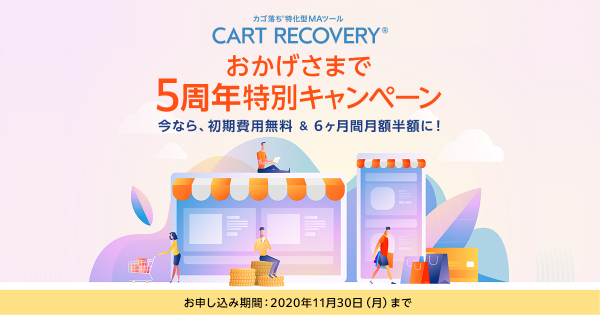 株式会社イー・エージェンシー(本社:東京都千代田区、代表取締役:甲斐真樹)が提供しているカゴ落ち特化型MAツール「カートリカバリー」は、2020年10月にサービス開始から5周年を迎えることをお知らせします。これを記念して10月22日(木)より、初期費用無料&6ヶ月間の月額半額キャンペーンを開催します。