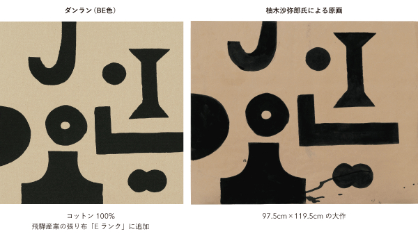 柚木氏の原画に近い色合いとし、柄は柚木氏の原画の配置のままプリントしているため、織りとはまた違った面白さが表現されています。本日同時発表の100周年記念モデル「第七號椅子」と並行して開発が進められたため、漆塗りの黒にもとても良く似合います。