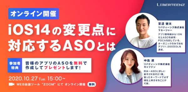 「iOS14の重要な変更点、アプリデベロッパー&パブリッシャーが対応すべき最新のASO対策とは」は、リバティーンズ株式会社が主催するオンラインイベントで、ASO(アプリストア最適化)についての最新情報を広くスマートフォンアプリ事業者に共有する目的で開催されます。