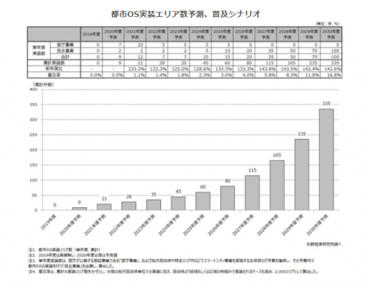 地方自治体や特定エリア内などでスマートシティ事業を実施する主体等による都市OSの実装エリア数は、2019年度実績は0件、2020年度予測が9件となり、その後2025年度には累計60件、普及率※は3.0%になると予測する。そして、2030年度予測では累計335件、普及率は16.8%に達する見通しである。