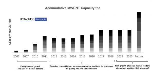 先進材料が商業的成功を果たすには長い時間がかかります。CNTも、過剰な期待を集めたのちに話題から外れてしまいましたが、その裏では目覚ましい進歩が遂げられており、未来は非常に明るいように見えます。もちろん、コロナウイルス感染症の世界的流行の影響もあり、生産や導入は制限されていますが、2020年の終わりに近づくにつれ、この状況はこのセクターにとって短期的にとどまる可能性があり、強い需要が広がっていくという初期の兆候が現われています。
