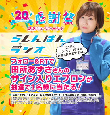 11月はらしんばんで、声優・アーティストとして大活躍の【田所あずさのらしんばんラジオ】を是非楽しみにしてほしい。