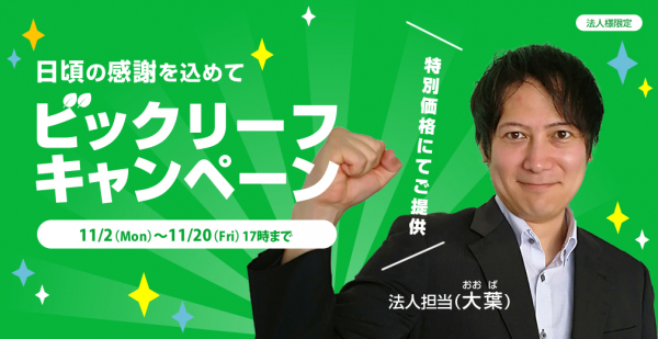 そこで、法人のエース担当者(大葉)の名前にちなんで、「ビックリーフキャンペーン」として実施!ぜひこの機会に、ビックリーフキャンペーンをご利用いただければと思います。
