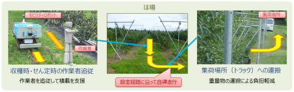 全国の果樹産地では、農家の高齢化が急速に進み、担い手の減少が止まらない問題を抱えています。そこで、果樹生産の担い手育成と国産果実の安定供給を実現するため、作業の中でも労働負荷が大きい収穫作業およびせん定作業について、自動走行(作業)機能を有する運搬ロボットでの作業支援効果を検証し、果樹栽培の省力化に向けた技術体系の確立を目指します。