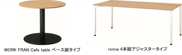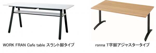 価格(税抜)は、「ワークフラン」カフェテーブル/スラント脚タイプ197,100円~、「ロンナ」T字脚アジャスタータイプ/長方形天板129,900円~です。
