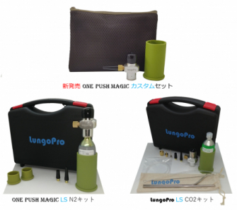 ONE PUSH MAGIC マジック カスタムセットは不活性ガスを噴射するマルチレギュレーター「ONE PUSH MAGIC カスタム」、隅々までガスを送り込む「アダプターノズル」、そしてガスカートリッジのガス圧の安定化とカートリッジの滑り止めを兼ねた「シリコンガススタンド」の3種類の商品で構成されています。実際に使用するためには用途に応じて別売の消耗品、「抗酸化ガスカートリッジ ルンゴN2」(高純度窒素ガス)または「ルンゴCO2」(高純度炭酸ガス)が必要です。なお、一度装着したカートリッジはガスを完全に使い切るまでは新しいガスカートリッジと交換できません。