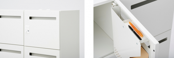 「IL」シリーズは、フリーアドレスの定着や、ペーパーレスで働き方が変化していく中で、仕事用ツールをコンパクトに収納する、低段・省スペース設計のパーソナルロッカーです。4人用の2段タイプと6人用の3段タイプ、2タイプをご用意。それぞれ、カラー2色 (ホワイト/ブラック)、鍵タイプ3種(シリンダー/ダイヤル/プッシュ) 、投函口あり・なしの計24パターンから選ぶことができます。