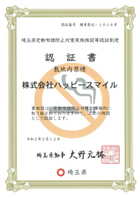 ・「受動喫煙防止対策実施施設」として埼玉県から認証 など