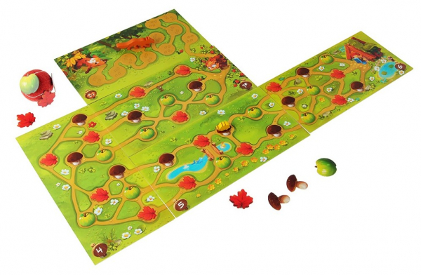 帰り道のマスには、リンゴ・キノコ・木の葉のいずれかが描かれています。ハリネズミを動かすために、進めたいマスに描かれているもののチップをボールで集めていきましょう。