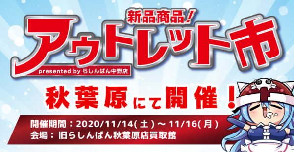 国内外に56店舗以上の中古アニメショップらしんばん(https://www.lashinbang.com)を展開する株式会社らしんばん(本部:東京都豊島区、代表取締役 齋藤浩之)は、2020年11月14日(土)~16日(月)の3日間限定で、東京・秋葉原にて特価セールイベント「アウトレット市」(https://www.lashinbang.com/news/1594/)を開催いたします。