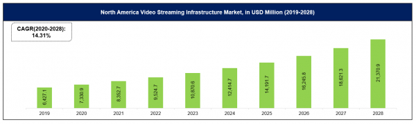 北米のビデオストリーミングインフラストラクチャ市場は、米国とカナダでのビデオ放送メディアプラットフォーム組織の出現が増加しているため、予測期間中に14.31%の大幅なCAGRを達成すると予想されます。地域市場は2019年に6,427.1百万米ドルと評価され、2028年までに21,370.9百万米ドルに達すると予想されています。