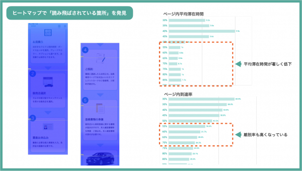 ウェブサイト内の『契約の流れ』コンテンツでは手続きが簡単であることをアピールしていましたが、まだ KINTO のサービスを理解しようとしている段階のお客さまに対しては気の早い内容になっている為、読み飛ばされていることが読み取れます。
