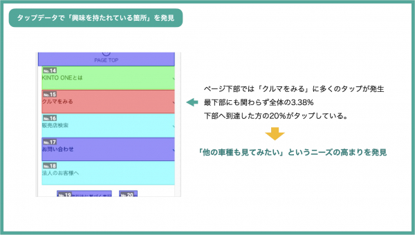 その後のお客さまの行動を SiTest のタップデータ機能を用いて深堀して分析したところ、【他のクルマを見る】というボタンに興味を示していることがわかり、「ハリアー以外の車種をページの早い段階で見たいニーズがあるのでは?」と仮説を立て、改善案につなげることができます。