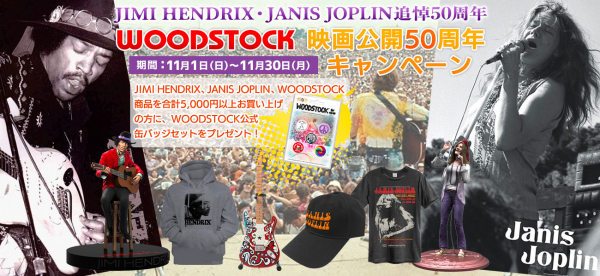 JIMI HENDRIXとJANIS JOPLINを偲び、JIMI HENDRIXとJANIS JOPLIN、WOODSTOCK公式商品を11月30日までにご購入の方に、WOODSTOCK公式缶バッジセットをプレゼントいたします。