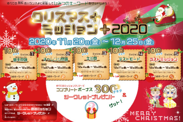 「デキタス」では、毎年恒例となっているクリスマス限定イベント『クリスマスミッション』を、今年も開催することが決定しました。指定問題をすべての教科で解くとミッションクリアとなります。
