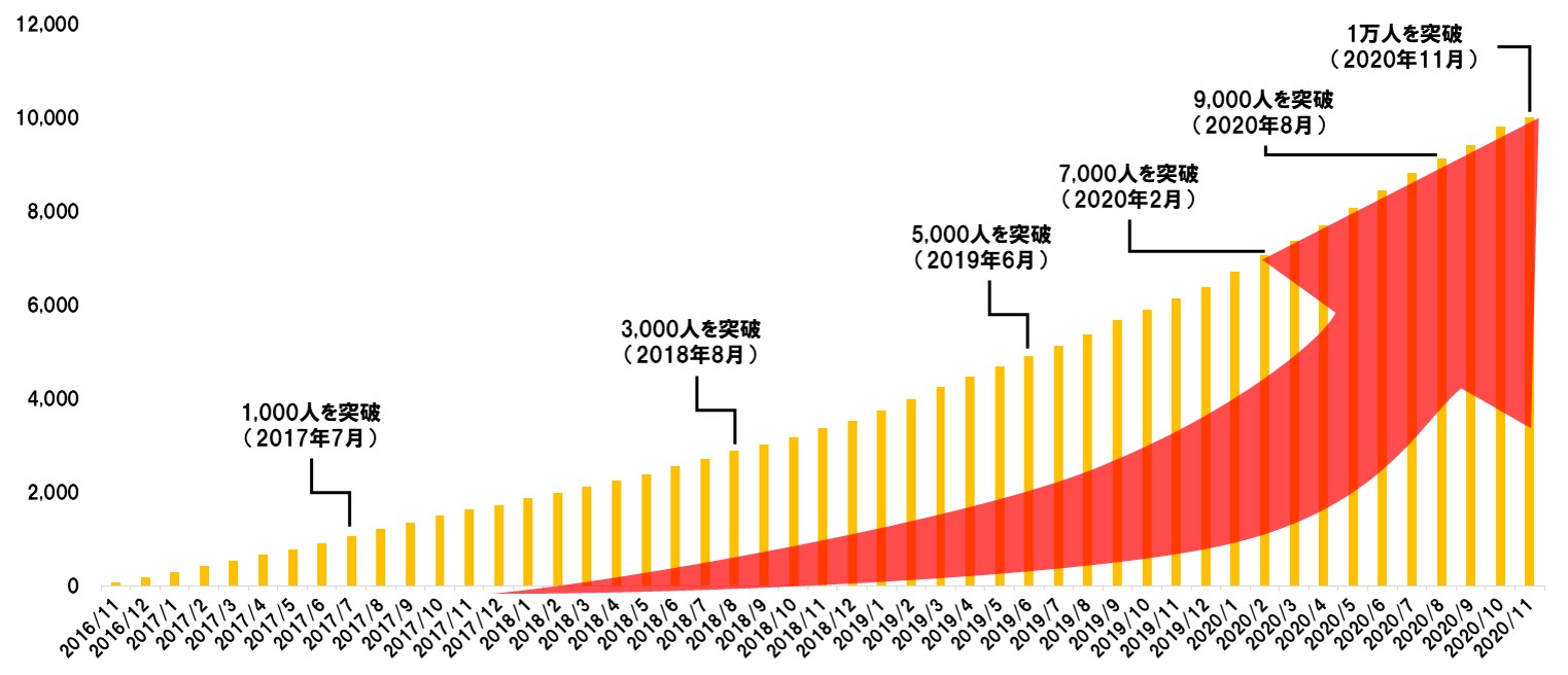登録会員数はサービス開始より順調に伸長し、2017年7月には1,000人を達成。その後もオリジナル求人やハイレベル求人といった魅力的な求人を掲載することで2019年6月には5,000人を、2020年2月には7,000人を超え、新型コロナウイルスなどの影響で転職に対しての安定志向が強まる中でも会員数を着実に伸ばし、この度登録会員数1万人を達成しました。最初の1,000人が登録するのには約9ヶ月間が必要であったのに対し、直近は約3ヶ月間で新たに1,000人が登録しており、高い成長スピードを維持することができています。