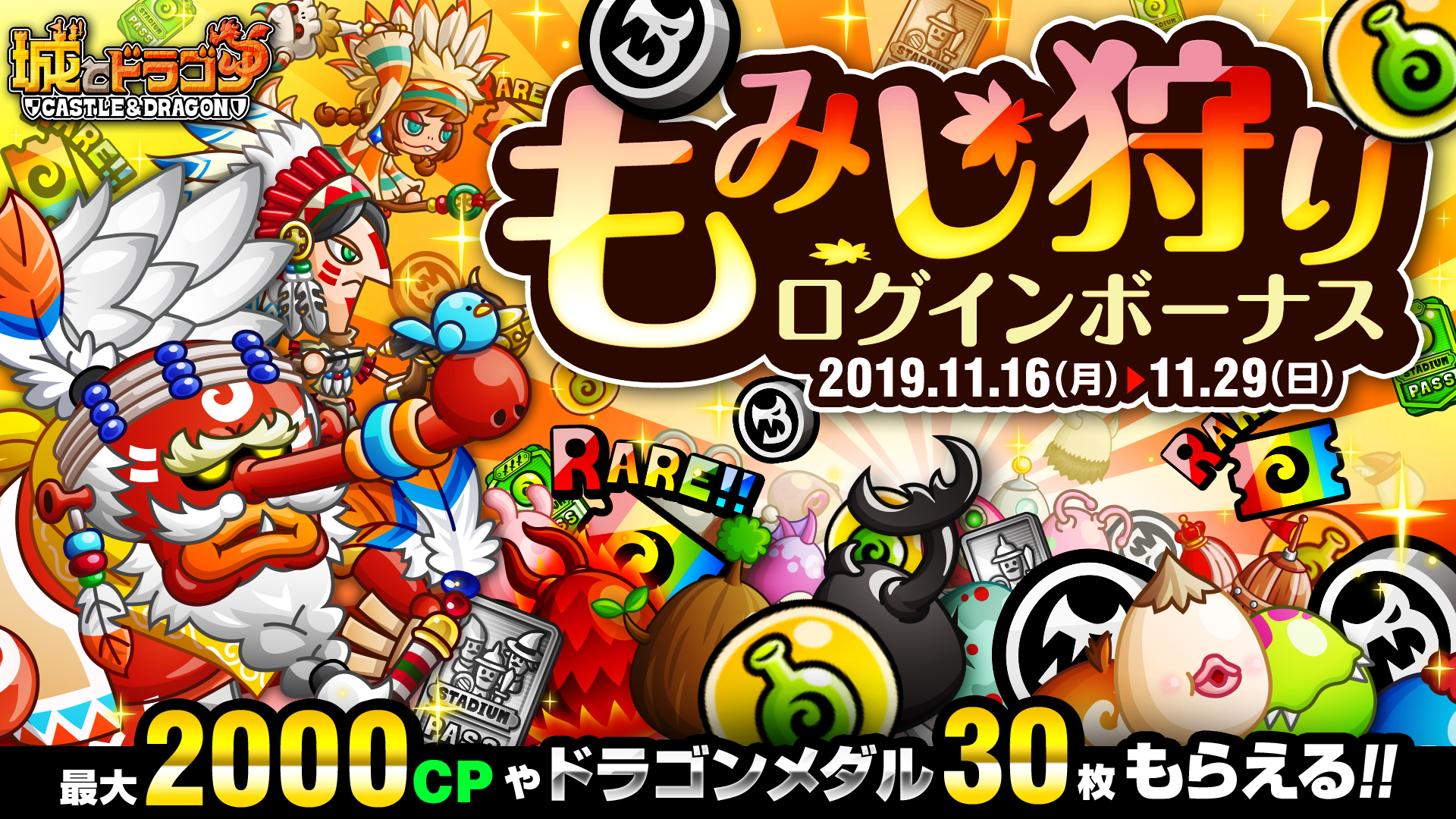 ゲームにログインすると、最大で2000CPやドラゴンメダル30枚などがもらえる「もみじ狩りログインボーナス」を開催します。報酬は期間中1日1回、最大14日間プレゼントされます。