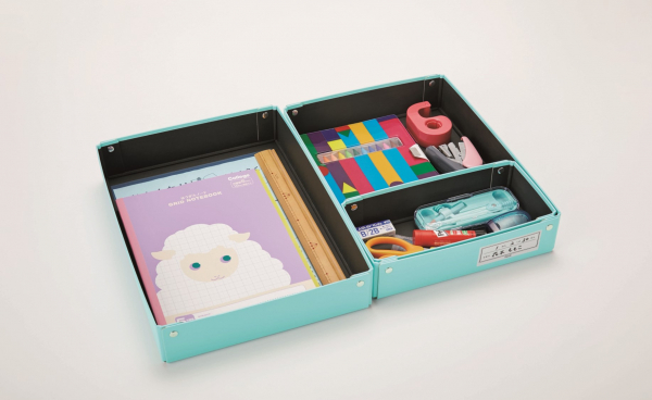 小学生の多くが学校机の引き出しとしてお道具箱を使用しています。毎日使用されるものだからこそ、安全性と整理収納のしやすさにこだわりました。今回発売するお道具箱は、従来の紙製お道具箱にはない「仕切り箱」が付いており、文房具を分類しながら収納することができます。手や体に当たっても痛くないよう本体四隅の角を丸く加工し、さらに内貼りが黒色で汚れが目立ちにくいなど、子どもが整理収納しやすく、親や先生も安心して使用させることができるお道具箱です。