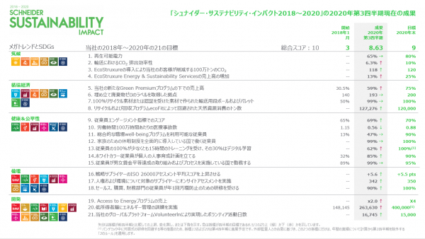 シュナイダーエレクトリックのサステナビリティ担当シニアバイスプレジデントであるGilles Vermot Desrochesは次のように述べています。「当社の第3四半期の非財務的業績は、私たちが2020年の目標達成に向けて努力を重ねていることを示しています。当社は、全世界のパートナー、お客様、地元コミュニティとのエコシステムの間に生まれるコラボレーションと信頼の心をとても誇りに思います。非常に困難な状況の中で達成したこれらの素晴らしい業績は、当社が国連のSDGsに貢献することを引き続き優先させていることを示しています。」
