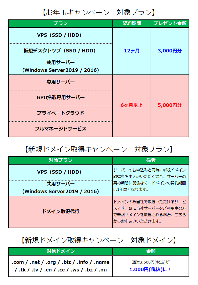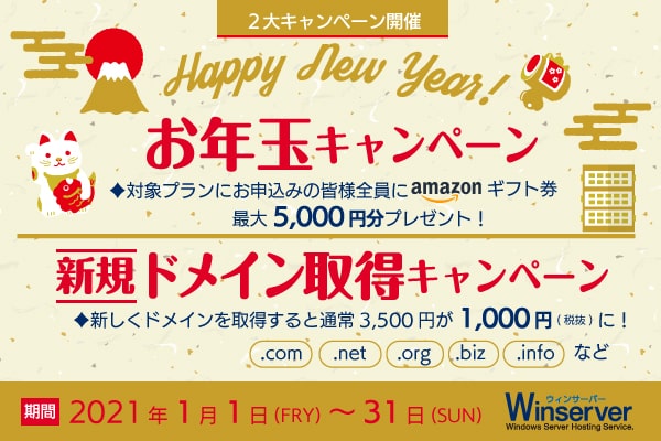 2021年1月、Winserver(運営会社:アシストアップ株式会社)は、「お年玉キャンペーン」「新規ドメイン取得キャンペーン」の2大キャンペーンを実施いたします。