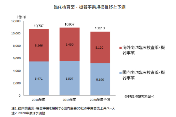 国内向け臨床検査薬・機器事業規模は、高齢者人口の増加や、予防医療への国の重点施策の継続などがあり、検査単価の減少等を検査数でカバーする形で微増を保ってきた。しかし、新型コロナウイルスの感染拡大が鮮明になってきた2019年度末から検体検査数自体が減少傾向となっている。健康診断および一般医療の受診控えなどが認められ、さらに新型コロナウイルス感染症以外の他感染症罹患者数が減るなどし、臨床検査薬・機器事業にも影響を与えている。