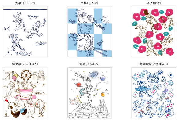 「鳥獣戯画」の魅力は、ゆるっとシュールに描かれた動物たち。その魅力を生かしながら、遊び心と現代のテイストを織り交ぜた6種のオリジナルデザインをご用意しました。遊園地で遊ぶウサギや、宇宙服で遊泳するカエルなど、思わずくすっと笑ってしまうコミカルなラインアップです。