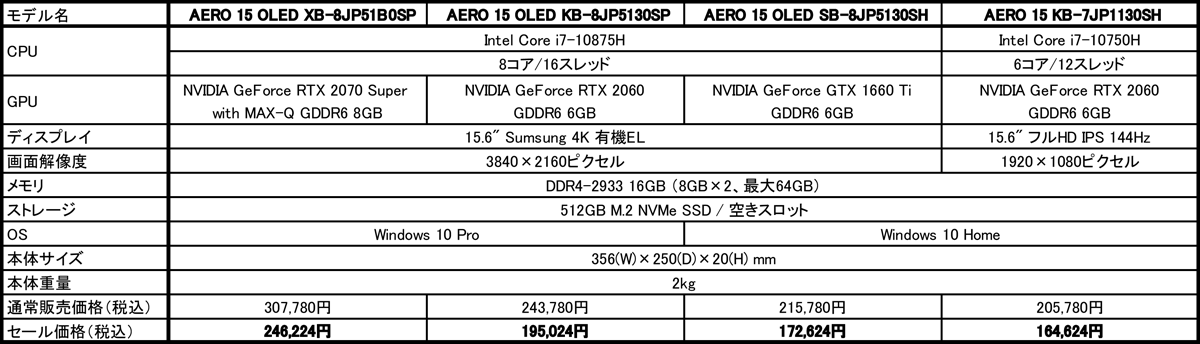 「AERO 15 OLEDシリーズ」の3モデルは、DCI-P3色域カバー率100%、HDR400 TRUE BLACK対応、コントラスト比100000:1という表示性能を持つ4K解像度の15.6型Samsung製有機ELパネルを採用し、CPUに8コア/16スレッドのIntel Core i7-10875Hを搭載した製品です。一方、AERO 15 KB-7JP1130SHは、フルHD 144Hz IPSパネルを採用し、CPUに6コア/12スレッドのIntel Core i7-10750Hを搭載した製品です。